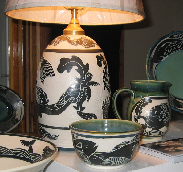 She also makes beautiful lamps, dishes and mugs, all made with her signature sgraffito style.