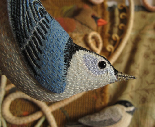 The nuthatch is just wonderful. We get nuthatches in our garden, and it always amazes me how these birds can eat peanuts while hanging upside down! The stitching on your birds is so neat, they’re just stunning.
