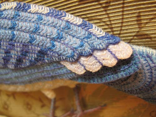 Now that the piece is finished, I can spend time reviewing how I made some of the parts. Opportunities to see the original piece are listed at the end of this post. The bluejay (life size) was one of the first birds I made, after the crow, because it’s on the large size and I wanted to make sure it would fit. The birds’ arrangement wasn’t set until the very end and I kept moving the critters around. That’s why I like to create separate elements–it’s very much like a collage that way. I have kind of an idea of how it will be, but I want room to maneuver the pieces. Tweaking is good because it brings surprises!