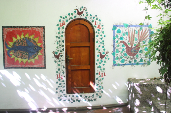 I love the doorway that is surrounded by painted greenery and birds. It seems fittingly seasonal and reminds me of the First Day of Christmas, what with the Partridge in a Pear Tree motif and all. The flanking piscine and avian images are beautiful too. Thank you for sharing artwork from sunny Chile!