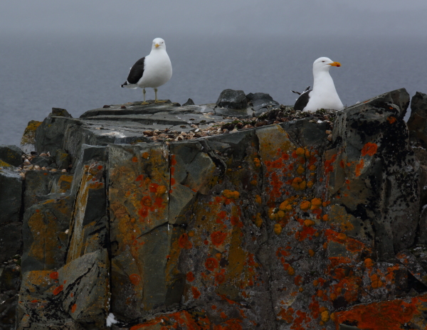 Love the contrast in colors…….the white against the gray sky, the different gray of the rocks, the contrast of the orange growing on the rocks. Lovely photo!