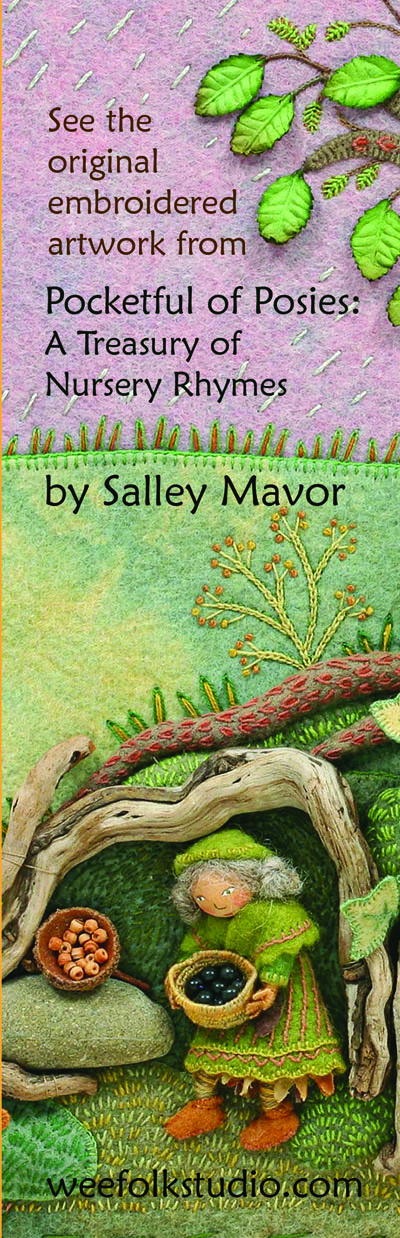 I had some bookmarks printed to advertise the Pocketful of Posies Traveling Exhibit. The image of “the old woman who lived under a hill” was chosen because the narrow vertical cropping provided lots of space for type. I’ve been including a bookmark with orders from my Etsy Shop if it fits in the packaging. I also distribute them to shops which sell Pocketful of Posies. Businesses that carry my book or quilting, doll making and needlework groups can request bookmarks by contacting me at weefolk@cape.com. Sorry, due to the postage cost, I can’t send out bookmarks to individuals.