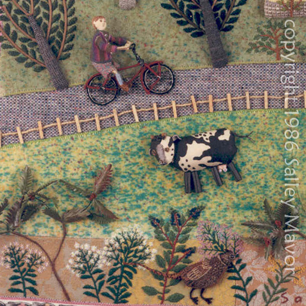 Working in miniature, there are many objects available for wheels; buttons, washers, snaps, key rings, etc. This series of images are mostly from my earlier work, starting with a detail from a piece I made in 1986. The wire bicycle is less than 2 inches long. Looking at these, I’m amazed that I had time to do all of the stitching because I had a baby and a preschooler to take care of. I remember working every evening after they went to bed.