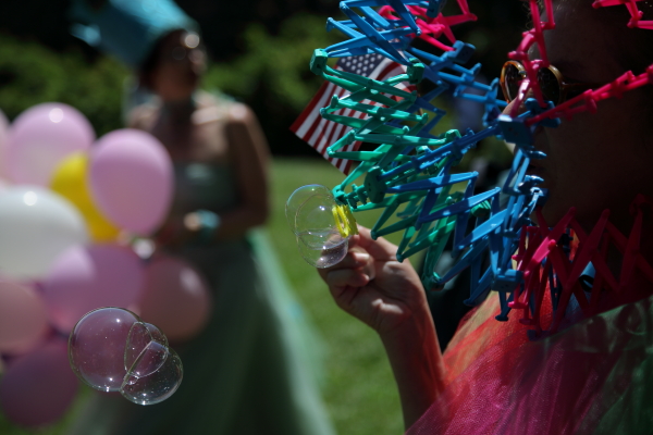 A grandmother and her two grandsons were armed with suds for bubble blowing.