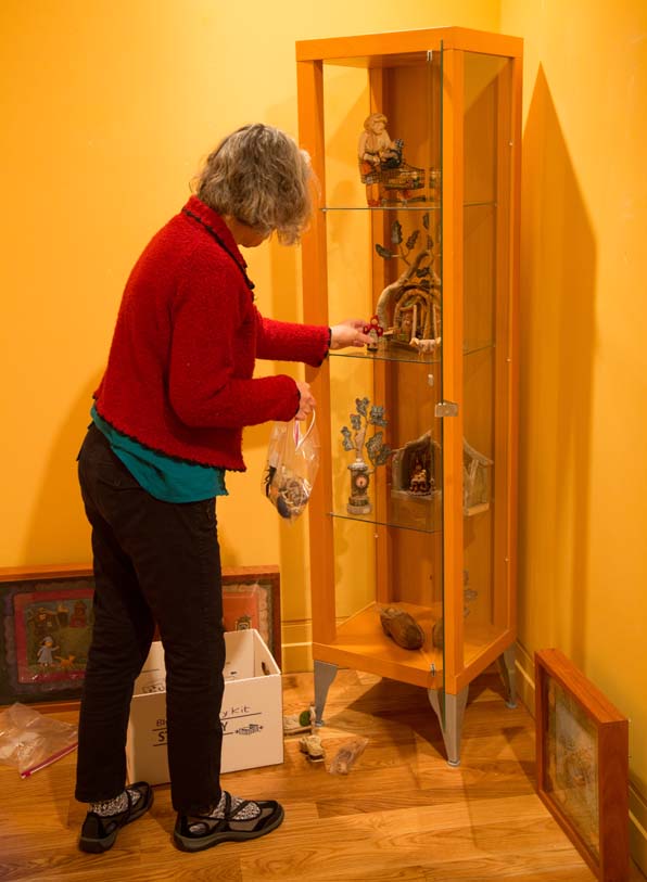 I brought some dolls and objects to put in a nice display case in the corner. I wish that Rob had told me to pull down my shirt in back for the photo, but he doesn’t notice those kind of things.