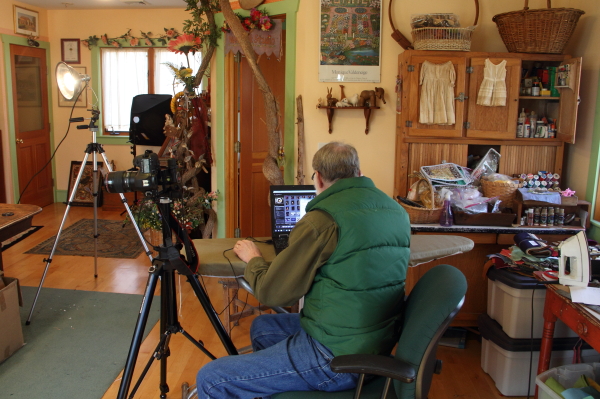 We’ve moved the photography operation into my studio and used a light box for the first time. With flood lights shining on the outside of its white walls, a softly lit space is created inside. Rob set up his computer on my ironing board and monitored the shots.