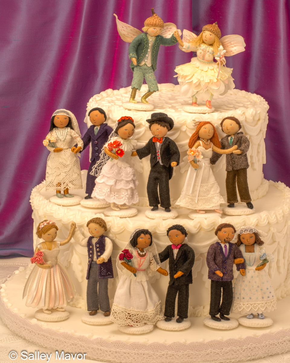 I’ve recently finished making a group of wedding couples for the new edition of Felt Wee Folk (2015 pub date). While I was working on them,  I imagined that the dolls would be photographed on a cake, lined up on tiered layers. As a prop, the cake didn’t have to be real, but I wanted it to look realistic. My friend Terry McKee provided technical assistance and moral support as we spent 2 afternoons in my kitchen working the problem. Terry and I have teamed up on a number of projects, including a real wedding cake and a baby quilt.