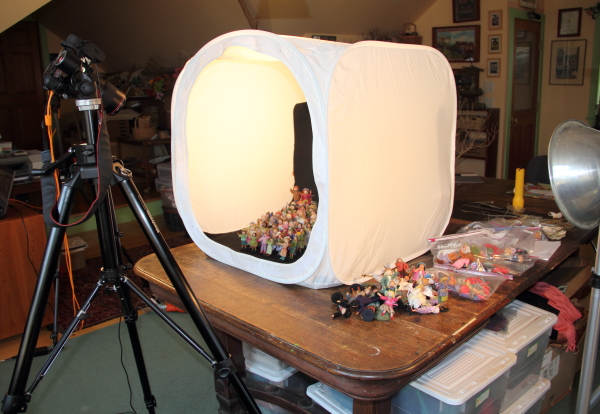 Rob and I are spending every spare moment in my studio, taking photographs for the revised edition of Felt Wee Folk. We need hundreds of pictures for the new book and we’re making good progress! There’s barely enough room for all of light stands, wires and equipment. The light box creates an even, pleasing light, so once it was set up, we spent a few days taking overhead shots of the dolls and step-by-step samples. I just started writing the new chapters and directions, which I find requires a different kind of discipline than stitching. So, if I don’t post for a while, I may be absorbed into the world of words, telling instead of showing. IMG_8330 We have another, larger light box that is good for the scenes. We’ve been taking pictures of the dolls all grouped together in a crowd, thinking that it would make a good book cover photo. Rob raised the tripod up really high to get the right angle. I wish you could see their little faces all looking up and waving, but that’ll have to wait until the book comes out in 2015.