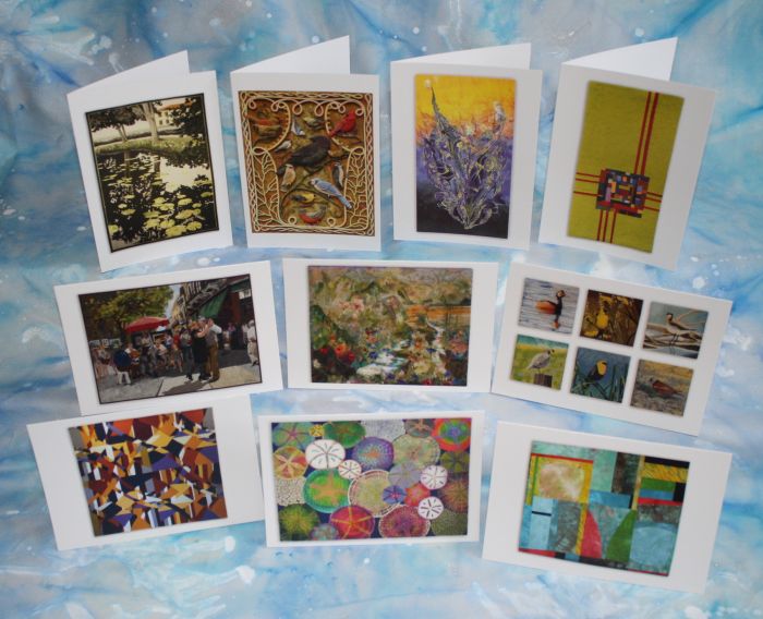 Look what came in the mail today! A pack of note cards that feature the unique works of SAQA (Studio Art Quilt Associates) Professional Artist Members. 10 art quilts are in the set, including my Birds of Beebe Woods piece. I feel honored to have my work selected for this collection, which represents the broad range of styles and techniques identified as “art quilts”. Card sales will benefit SAQA and are sold at a very reasonable price on their website here.
