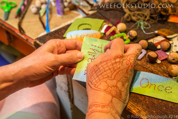 This is a teaser of sorts, because the dolls in the scene are some of the models in my upcoming book, Felt Wee Folk: New Adventures (Spring 2015), the long-awaited follow-up to Felt Wee Folk: Enchanting Projects. Rob took the photo of them holding up the stitched signs, like a group at a rally. I’ll use the photo in my power point show and Facebook cover banner.