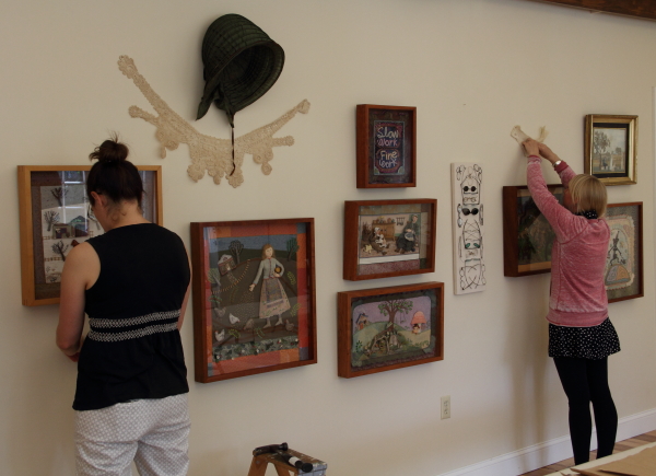 This past week, I helped install my show at Falmouth Museums on the Green. The photos below give a behind the scenes look at the process of hanging my framed artwork along with historical needlework and other interesting objects from the museum’s collection. Salley Mavor: Expressions in Stitches, Then and Now opens today and closes on August 16th. I will be giving a presentation about my work at the “Tea at the Museum” on Saturday, July 19th, 1:00 -3:00 pm. The museum hours are Tuesday ~ Friday 11:00 am to 3:00 pm, Saturday 11:00 am to 2:00 pm and Monday evening 5:00 to 7:00 pm.