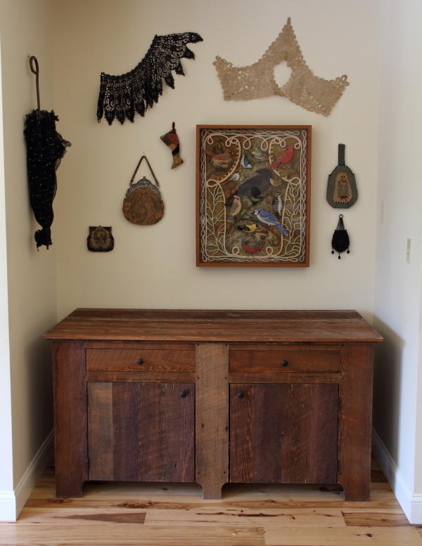 Amanda and I started planning the exhibit a year ago, when she came up with the brilliant idea of juxtaposing my artwork with historic items that never seem to make it out of the basement archives. We met several times over the winter and looked through boxes full of tissue wrapped treasures. Of course, I was attracted to the textiles, but we also put aside other objects that fit in with the theme. I mounted a collection of old eye glasses and leather doll shoes to hang along side my pieces.