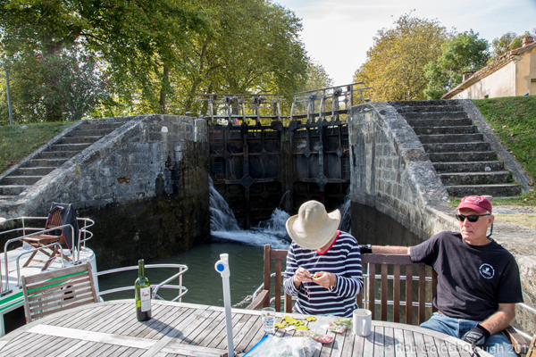 During our barge trip in France, Rob took this photo of me engrossed in stitching felt fairy tunics, while waiting for a lock to fill along the Canal du Midi.