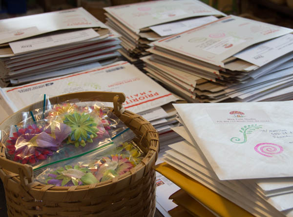To those of you who’ve pre-ordered the book through my Etsy Shop, thank you for your patience. It won’t be long before your copy is sent off. I’ve been busy preparing for the book’s arrival like an expectant parent for a new baby. My studio is stacked with 100’s of addressed US Priority Mail envelopes filled with extra goodies for my Etsy customers. Each book comes with a poster (folded flat), a wee folk notecard, and faux flowers to make 2 fairies. These items will also be included with orders placed after the book is released. And, of course I’ll autograph each book! FYI, Etsy now accepts credit cards in addition to Paypal. The book is also available through booksellers, but it doesn’t come with these bonus items.