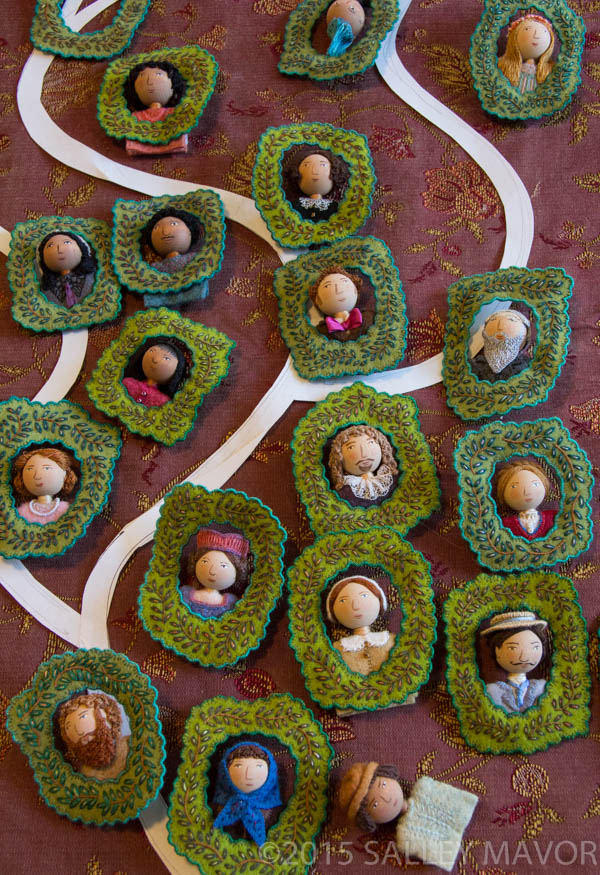 After the wreaths were completed and the busts sewn in place, I figured out their arrangement on tree branches. They would be grouped according to time period, going from the past at the bottom to the present at the top.