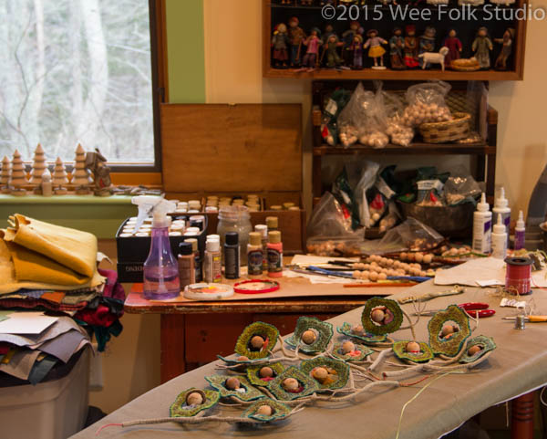 The heads are based on the wee folk dolls in my how-to book Felt Wee Folk – New Adventures. This little lady’s bonnet is made with wire wrapped with embroidery floss.