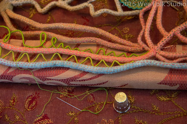 I made felt covered wire leaf forms for the corners, first embroidering the strips of felt with seed stitches.