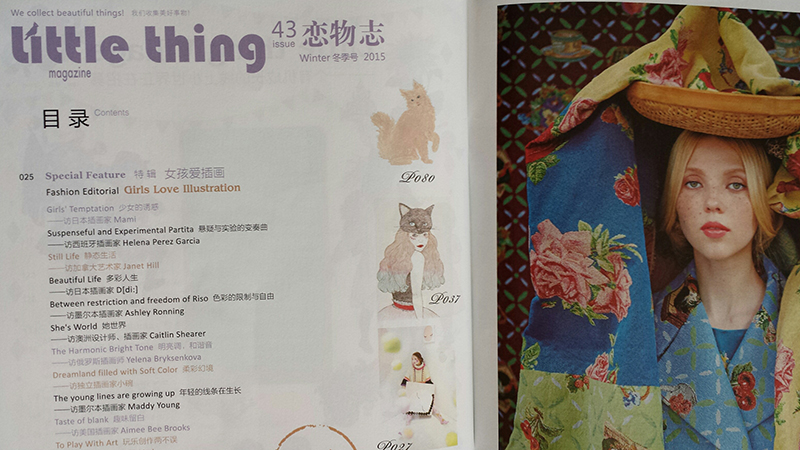 I was excited to receive a copy of Little Thing Magazine, a style and fashion quarterly, which includes an article about my work. It’s printed in Chinese, with a smattering of English headings, but I think most people will just look at the pictures. The winter issue’s theme is Girls Love Illustration and features a dozen interviews with illustrators from around the world. The magazine is girly for sure, but not in a too cutesy. Its editors do a good job of gathering a sophisticated collection of “beautiful things” to pour over. I’m not sure who it’s aimed at, but there’s definitely a youthful, playful spirit that many people (besides teenage girls) can appreciate.