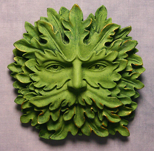 At first, I was attracted to the “green man” concept, but veered more in the direction of Assyrian sculptures, which have wonderful stylized beards. I stayed with the green palate and added blues and browns.