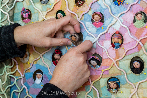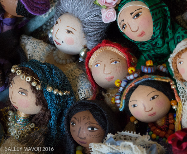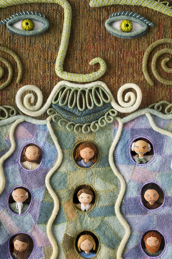 UPDATE: In this series, which includes Face Time and Whiskers, I’ve focused on bringing to life different people from around the world, using themes of history, style and cultural identity. In each piece, head and shoulder busts peek out of “cameo” framed holes. Their faces are painted 20mm wooden beads, with wigs and adornments, similar to the doll heads in my how-to book Felt Wee Folk – New Adventures