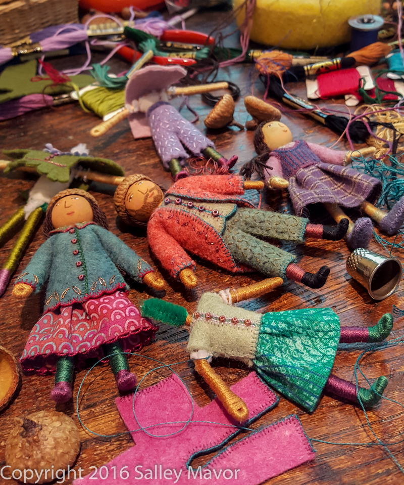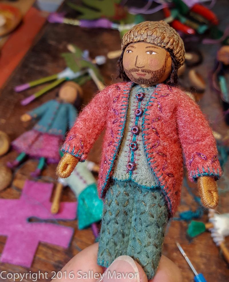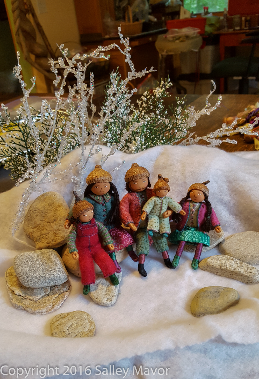 I am very pleased to introduce the 5 members of the Frost Family. Mom, Dad, brother, sister and baby are all dressed warmly for the coming winter. They are doll-house sized, from 2.5” to 4.5”, with hand embroidered wool felt outfits and acorn capped painted wooden heads. Even though they are sturdy enough to be played with by children, they aren’t just for children and can be appreciated by all ages. Every once in a while I make a group of related wee folk dolls and offer them as a fundraiser for a local non-profit organization.