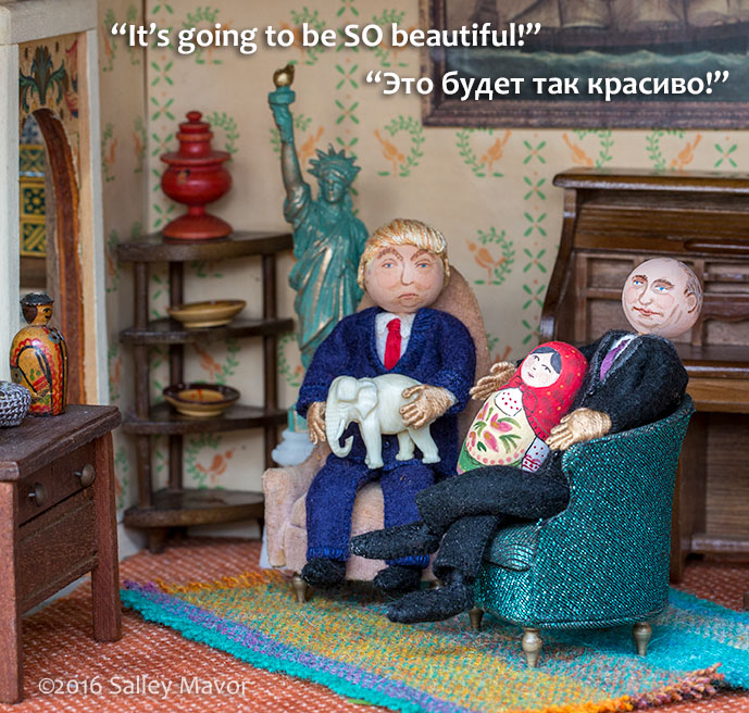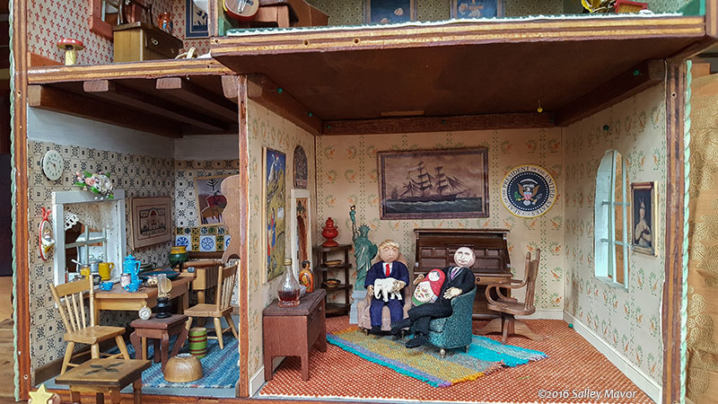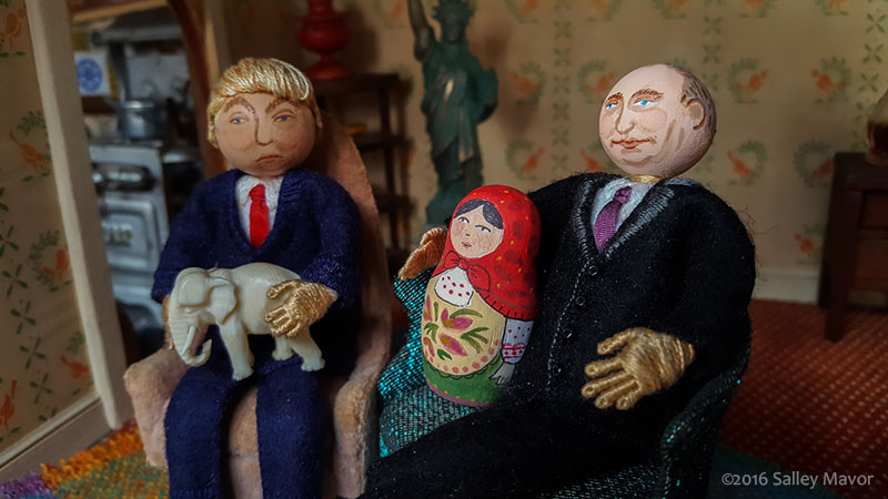 Love that your Wee Folk Productions are set in a treasured dollhouse. As to what makes art an effective form of social commentary or political criticism? I found this quote at random: “Art has long been a forum for expressing opinions about the state of politics and society. Through caricature, satire, symbolism, and allegory, artists have commented both explicitly and subversively on everything from vanity and excess to corruption and greed, and poked fun at everyone from the anonymous masses to the privileged elite. Often widely disseminated through prints and other reproducible media, the ability of such images to strike a meaningful chord and leave a lasting impression has at times made political satire dangerous terrain for artists, especially those living under the governance of repressive regimes.”