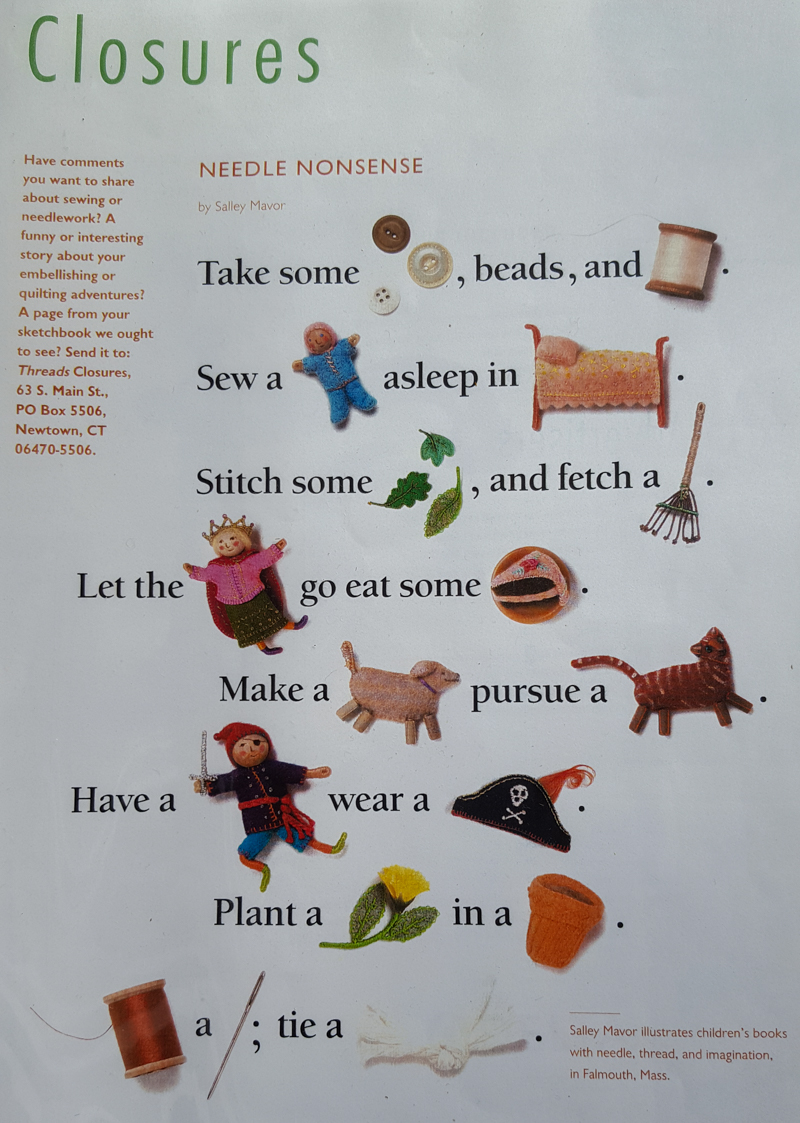 While cleaning up my studio last summer, I came across a plastic bag full of small characters and other props I’d made years ago. The items were used in place of words in a rebus I wrote and illustrated sometime around 2000 for Threads Magazine’s Closures page.