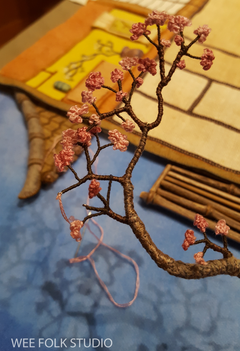 Here’s a video of stitching French knot blossoms on the ikebana (floral arrangement).