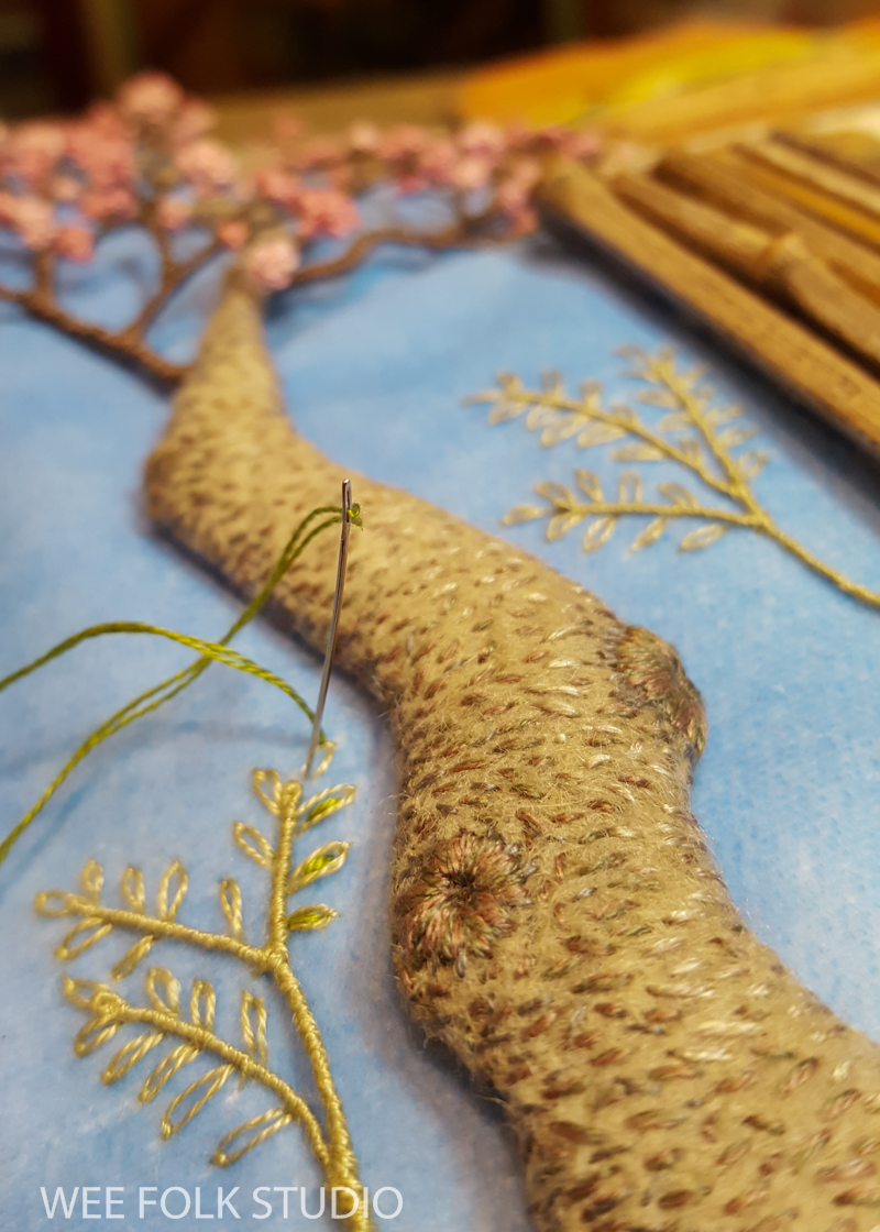Outside, the cherry tree provided a welcome opportunity for curves and repetitious little stitches.