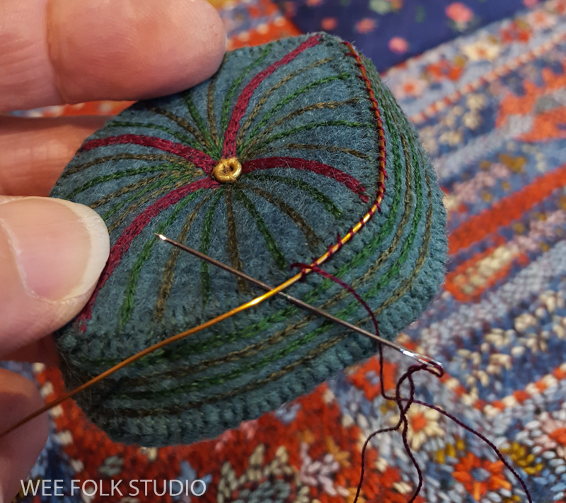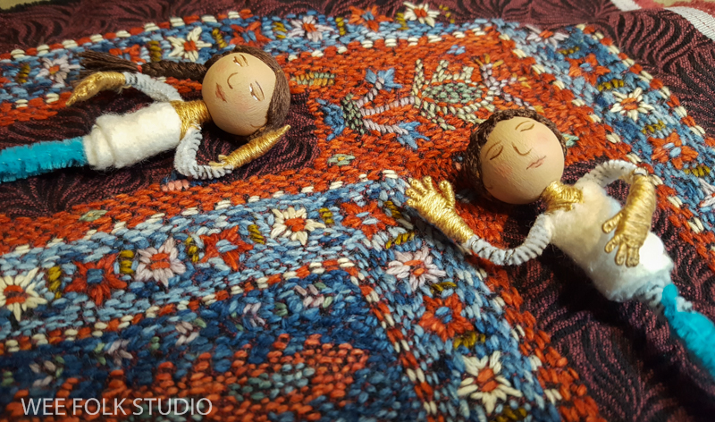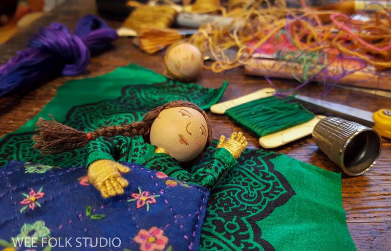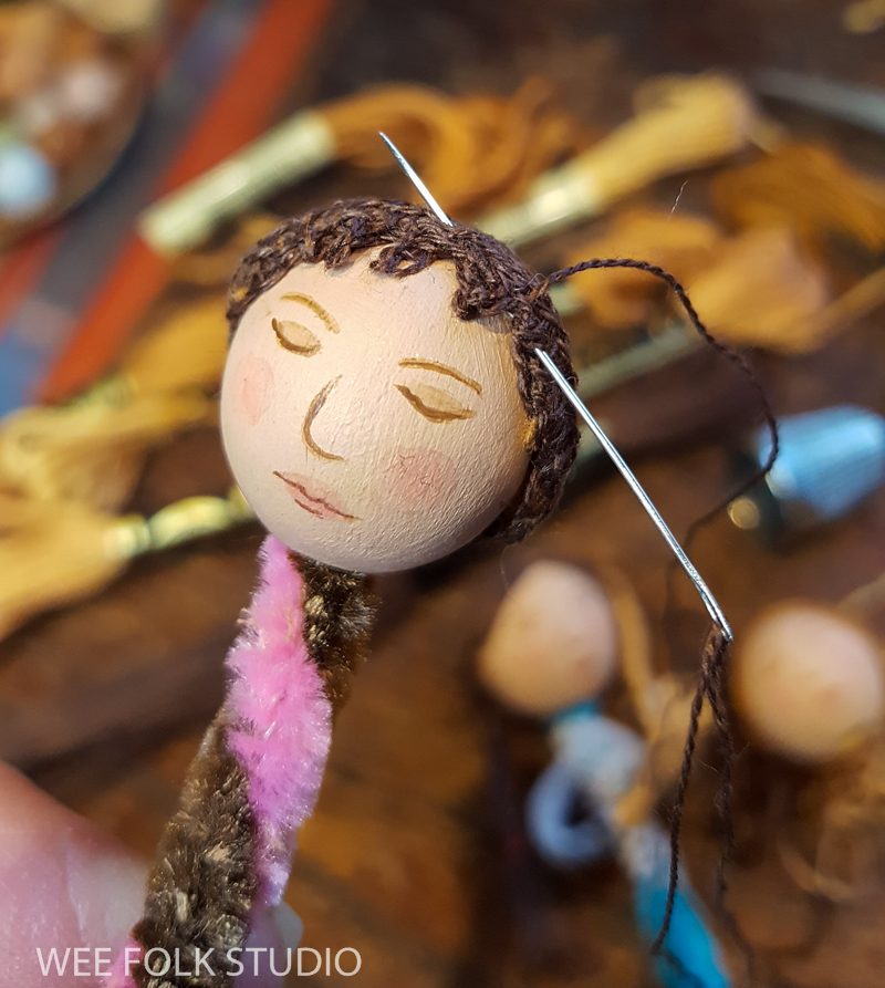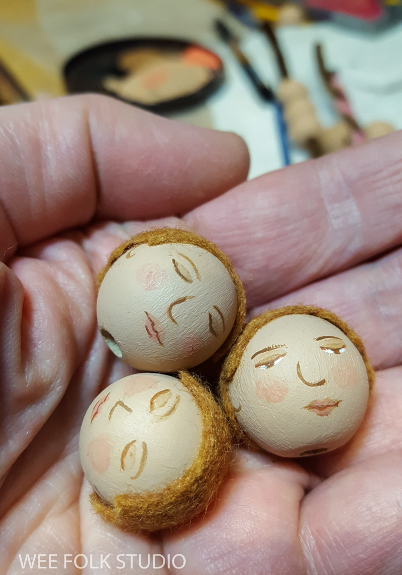When creating characters, I start with painting faces on bead heads. Based on past experience, I think painting their features is more nuanced and emotive than anything I can achieve with stitches and fabric. It works best to paint a bunch and pick out the ones I like, kind of like an audition. Then I add hair, using the same wig-making technique shown in the new edition of my how-to book, Felt Wee Folk – New Adventures.