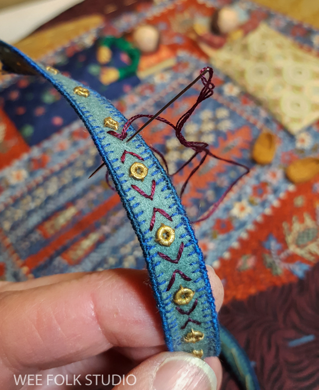 Each of the illustrations has its own patterned strip, which will be used in the book design phase of the project. To keep it rigid and straight, I stitched Soft Flex beading wire along the edge. It feels good to have finished this one and I’m excited to move on to the next scene, which will be from a very different part of the world.