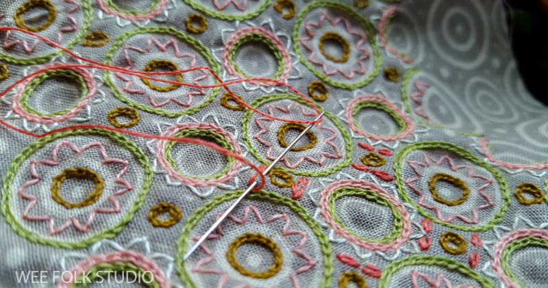 For this coverlet, I gave up on finding a print that I liked and added embroidery to a simple grey and white print.