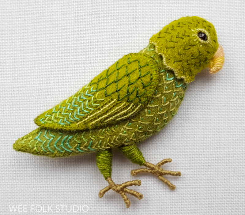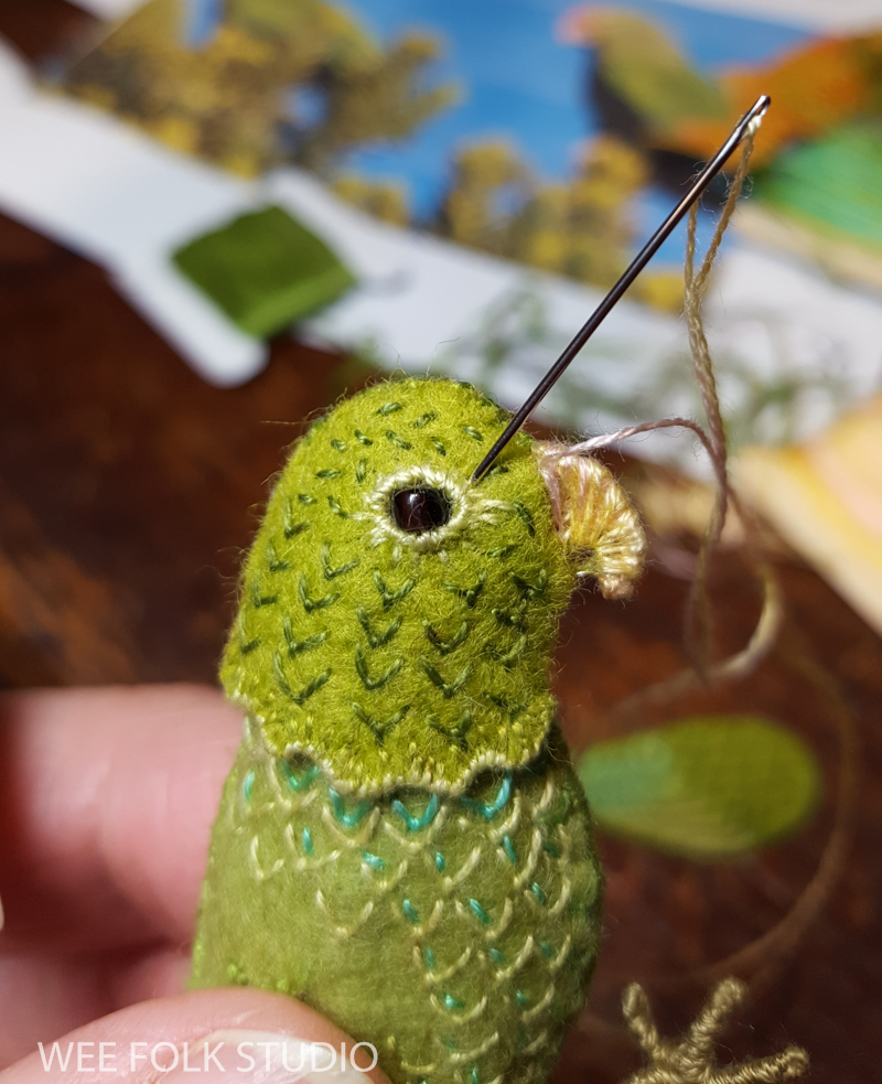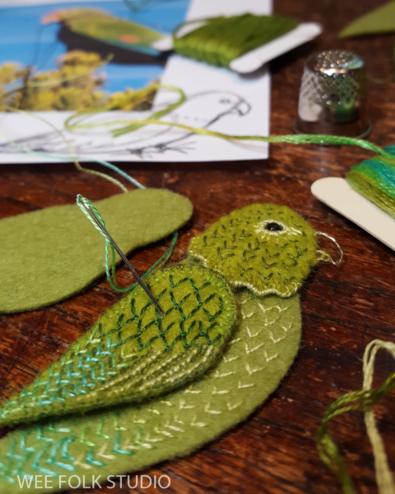 After doing photo research and drawing a simple parrot shape, I cut out pieces of felt and began embroidering feathers.