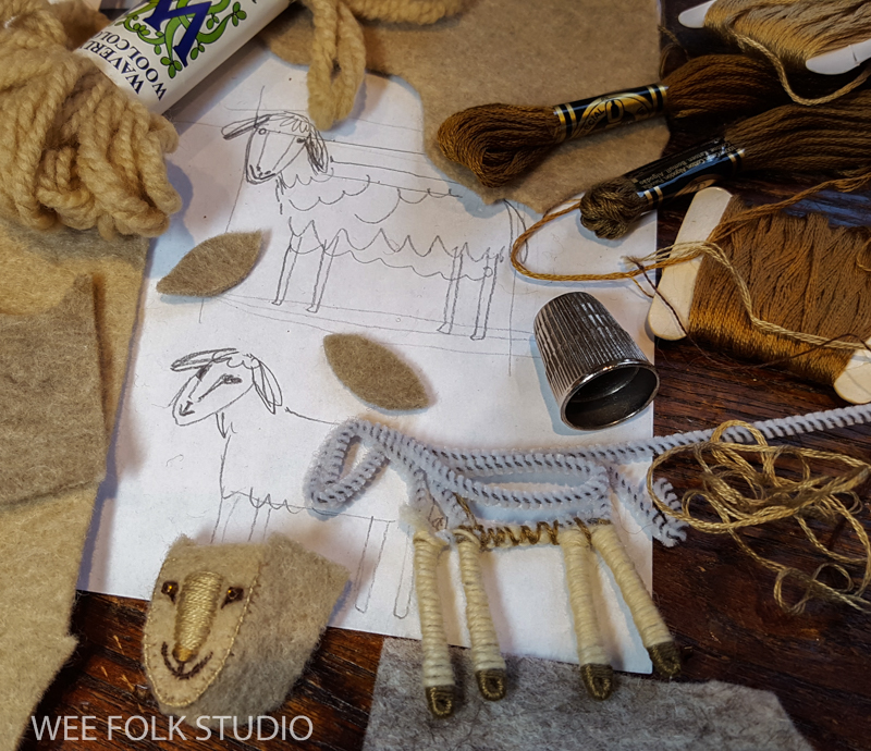 The sheep’s legs are made with a pipe cleaner, using the same basic technique that used for the dolls in my how-to book, Felt Wee Folk. It’s face is embroidered wool felt, with seed bead eyes.