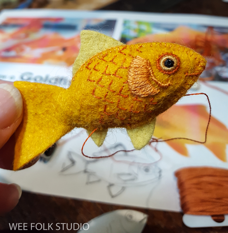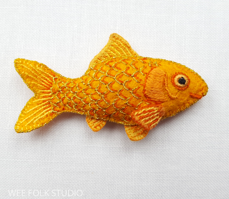 Beside all the yellow and orange tones, the fish needed just a hint of glimmer, so I added some metallic thread to its scales.