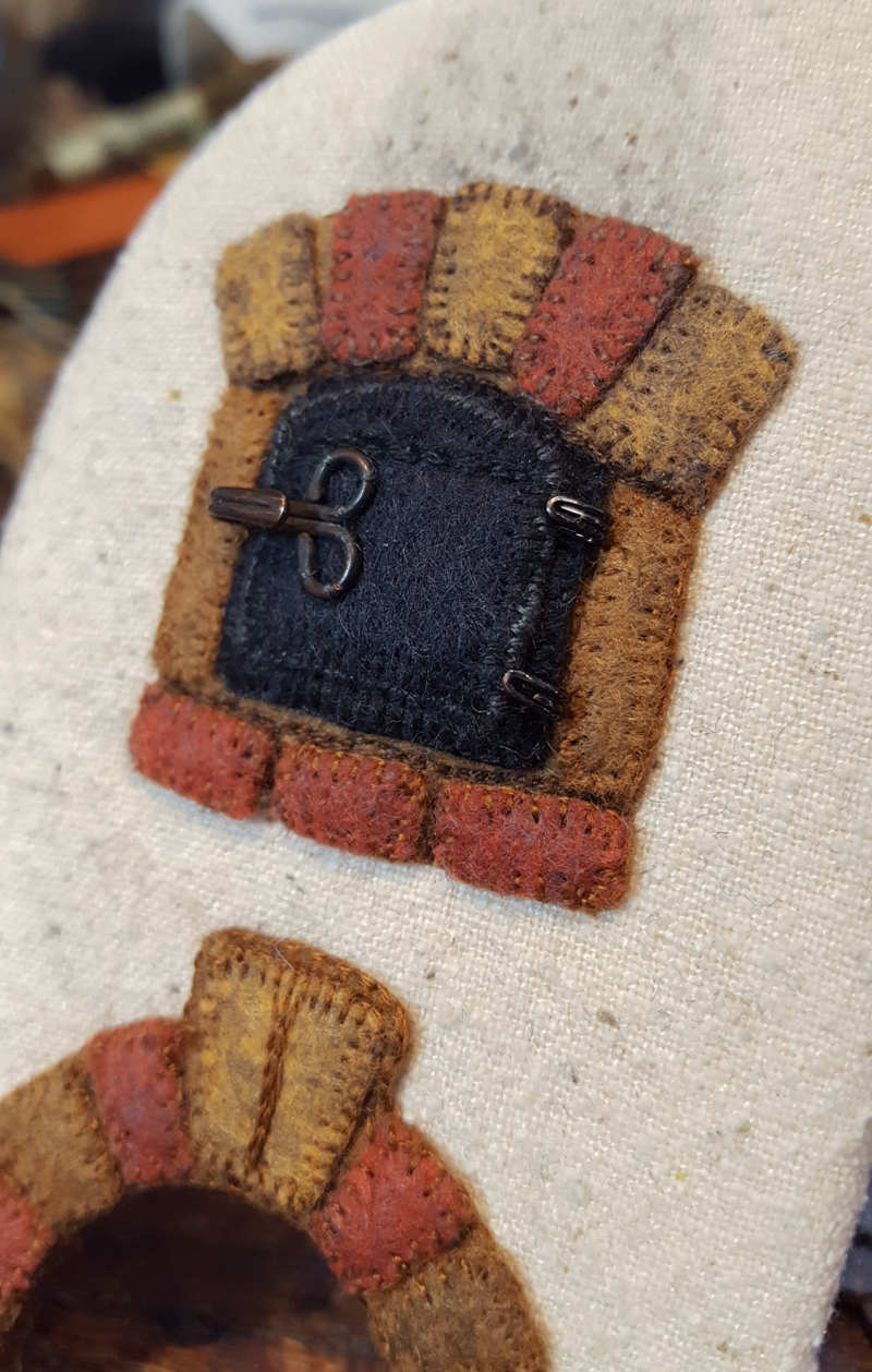 I started with the stove, using wool felt for the bricks and raw silk to convey the bumpy texture of masonry.