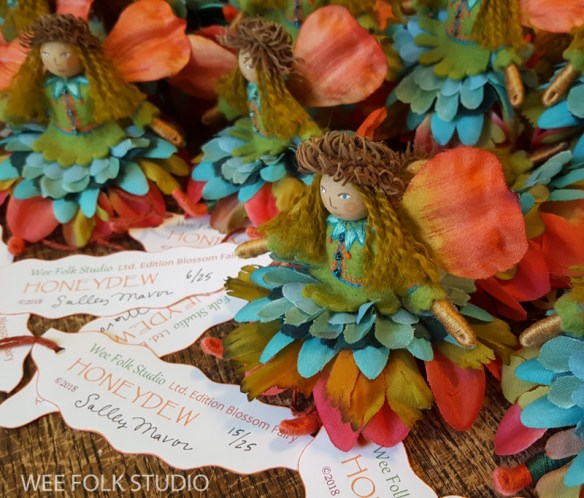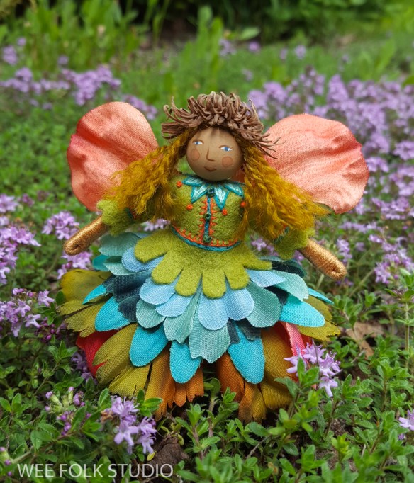 Please meet HONEYDEW, the newest Blossom Fairy! She is 3 3/4″ tall, with crimped blond hair, spiky acorn cap hat, embroidered wool felt tunic and petal skirt. I don’t sell one-of-a-kind dolls, but every once in a while I offer a ltd. edition of 25 dolls similar to the ones in my how-to book, Felt Wee Folk. You see, I only work on them outside of my studio, while traveling, so there’s no predicting when a set will be finished. This is my way of controlling the urge to make them all the time. As some of you’ve discovered, making wee folk can become addictive! That isn’t such a bad thing, but if I succumbed to the impulse, I would be less inclined to commit to long term projects like our animation Liberty and Justice or the children’s book I’m working on right now. To see previous ltd. editions in the archives, click here. Information about purchasing HONEYDEW is at the end of this post.