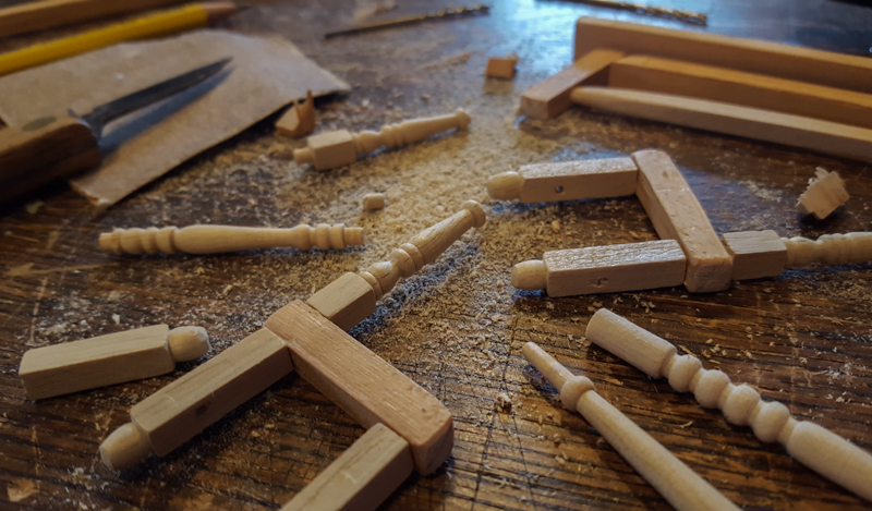 I made the table and chairs out of pieces of wood, including small turned balusters that are sold to make doll house stairs.