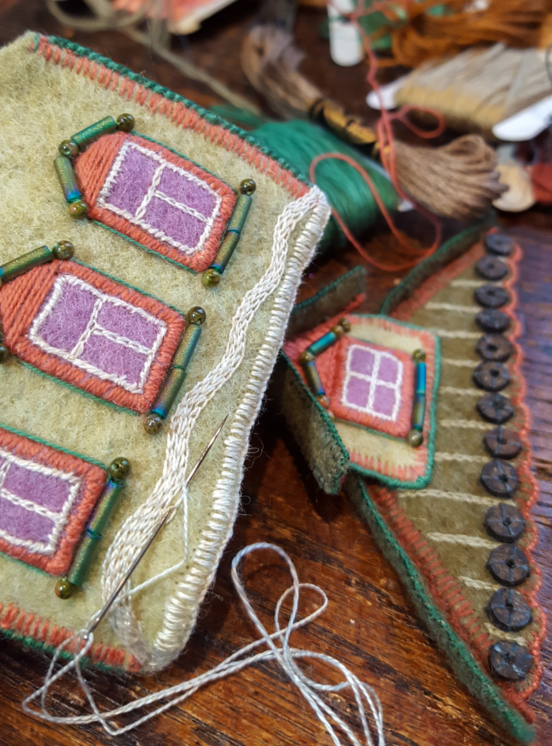 and decorating the felt curtain with diagonal slashes of thread.