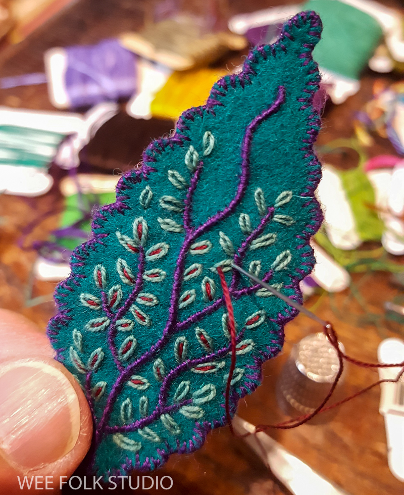 Another favorite stitch is the single daisy chain, which I use a lot for leaves, like on this tree. The branches are formed with thread covered wire.