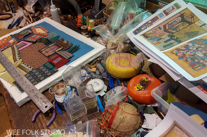 For this courtyard scene, I sorted through piles of fabric in my stash to find a combination of colors, patterns and textures that worked together and lent themselves to the environment. Then, following the layout drawing, I built structures and embroidered architectural details, using my preferred stitches; blanket and chain.
