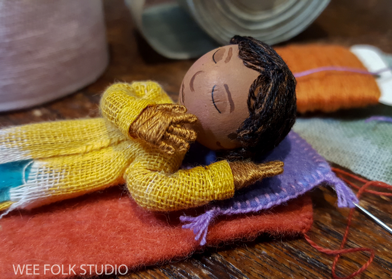 I made heads and arms for 2 sleeping boys. No legs were necessary, since they will be covered up. Except for the hands, they are similar to the dolls in my how-to book, Felt Wee Folk: New Adventures.