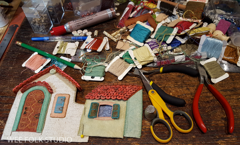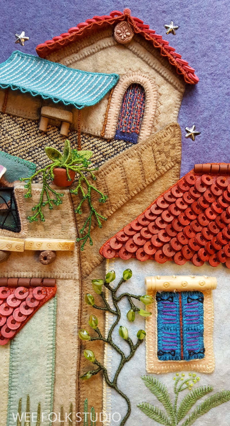 During the months-long process of working on a scene, I keep needed materials and supplies close at hand, with the actual work space increasingly limited to a little corner of my table. The surface in the foreground of the photo is an ironing board. The color scheme changes from page to page, so I select a new combination of felt and thread for each illustration. All of the stitching is done while holding the pieces in my hands, including this building and roof. There’s more about the roof tiles in Part 1.
