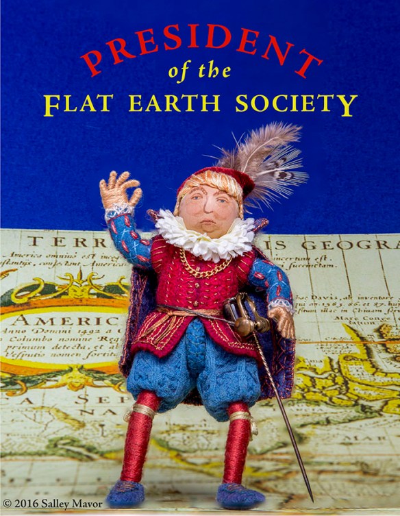 You may ask, how did this happen? Economic concerns, basically. The members of the venue’s board of trustees were afraid that because this show is controversial and asks the viewer to ponder our current political climate, some donors might be offended and donations could fall off. The overall opinion was that my show should be emptied of political content, with no dolls who are recognizable as Trump or Pence, etc. The idea was to remove the polarizing figures so that everything will be fine and no one will be upset. They didn’t want anything political, so it meant no film and satirical cartoons from the Wee Folk Players. No Trump in a Tudor style outfit as President of the Flat Earth Society and no Pence dancing with a trans person dressed in fishnets and high heels. I think that most board members were unaware that their no tolerance position on any political content would result in the show’s cancellation and create an absence that would have to be explained to the visitors who show up to see my work.