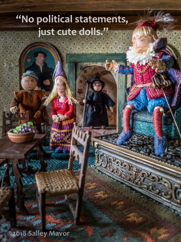 My exhibit was to demonstrate how a contemporary artist uses fiber art techniques to make a statement about today’s world. The new direction of my work leaves behind the cute idyllic and safe fairy world and jumps head on into political territory. The dolls are a metaphor for playing house in a controlled environment, one that has been taken over by outside political forces. For me, the work is about stepping away from a safe, sheltered existence and into a very real reality, one where there is possibility for action toward making a difference in the world. You could call this new direction “sweet resistance art”, since it delivers a strong message in a pretty package, one that is not in your face, even though it does have a tough meaning. My new work has been described as witty, ironic, sophisticated and adorable but chilling. It is a thoughtful critique of the current administration in Washington, with every detail chosen for a reason, and all based on actual things said or done. I don’t expect everyone to agree with my point of view, although many find my artwork refreshing and full of comic relief. To remove the political part would be like taking the stuffing out of the dolls, leaving limp characters of very little consequence and nothing important to say.