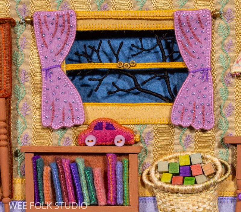 Through the window, you can see a thread wrapped tree branch. It’s inside a balsa wood box that I sewed in back, behind the background fabric. I’ve used this method in other scenes where I want to show receding depth. It’s a way to make use of the hidden space inside the stretcher.