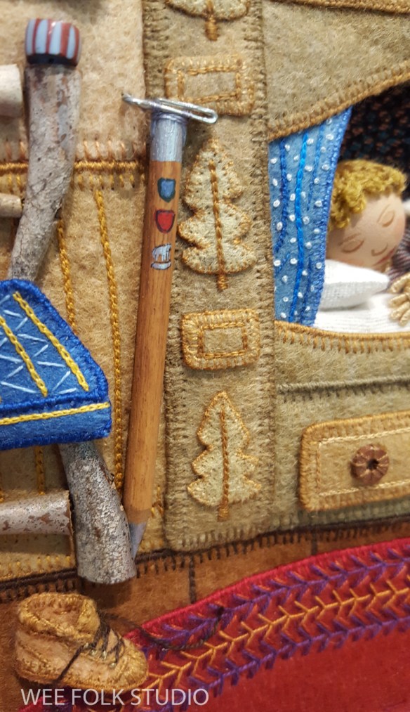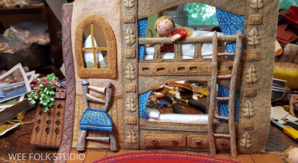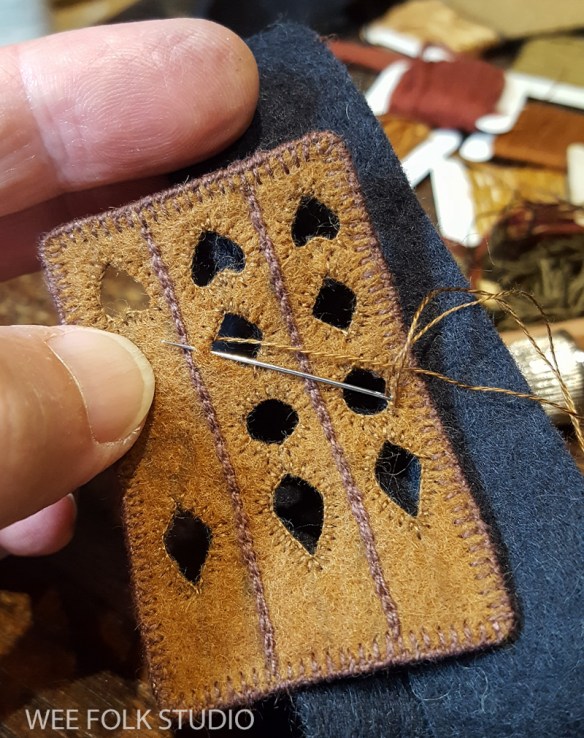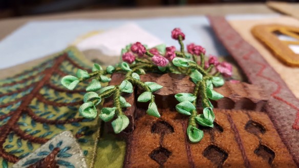 To make the window, I edged a piece of felt with blanket stitches and wire. Even with photos documenting the process, I wasn’t immediately sure how I made the window grilles shown below. I remember looping lines of thread on wire, which was similar to casting on a knitting needle. Then, I joined 2 lengths by stitching them together down the middle. The wire gives the grilles enough firmness to hold their shape after being sewn in place inside the window frame.