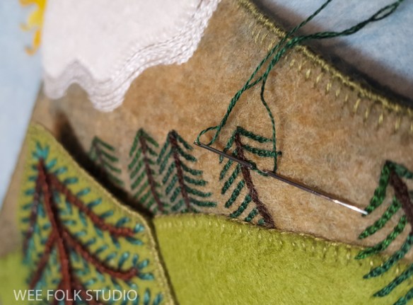 I made stylized fir trees with covered wire trunks and branches. The branches and pine needles are stitched with variegated pima cotton made by Caron.