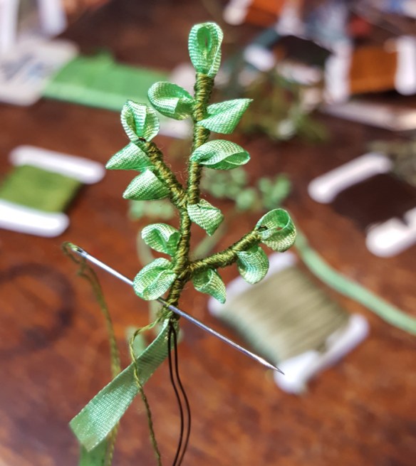 For the flowering plant, I tried something new for the leaves; silk ribbon. I will now attempt to describe how this works in steps. Keep in mind that you use one long length of ribbon to make multiple leaves. 1. Twist wire to form stems. 2. Starting at the tip, loop a silk ribbon leaf. 3. Cover wire stem and ribbon by wrapping with embroidery floss. 4. Loop more leaves down the stem, covering the ribbon and wire with floss. Yikes, this is hard to explain! I hope that you can understand the process somewhat.