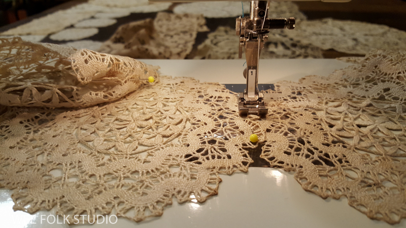 This project didn’t require any fussy hand-stitching, so I dusted off my sewing machine and plugged it in. I pinned together rows of doilies and sewed the overlapping edges with the zig-zag stitch.